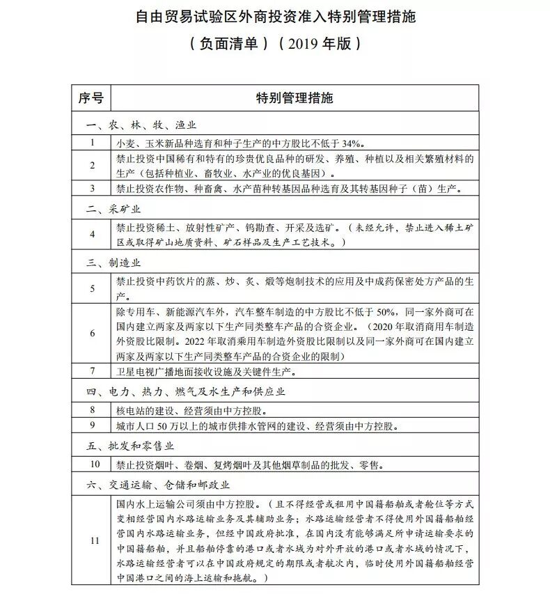 附件二:《自由贸易试验区外商投资准入特别管理措施(负面清单)(2019年版)》