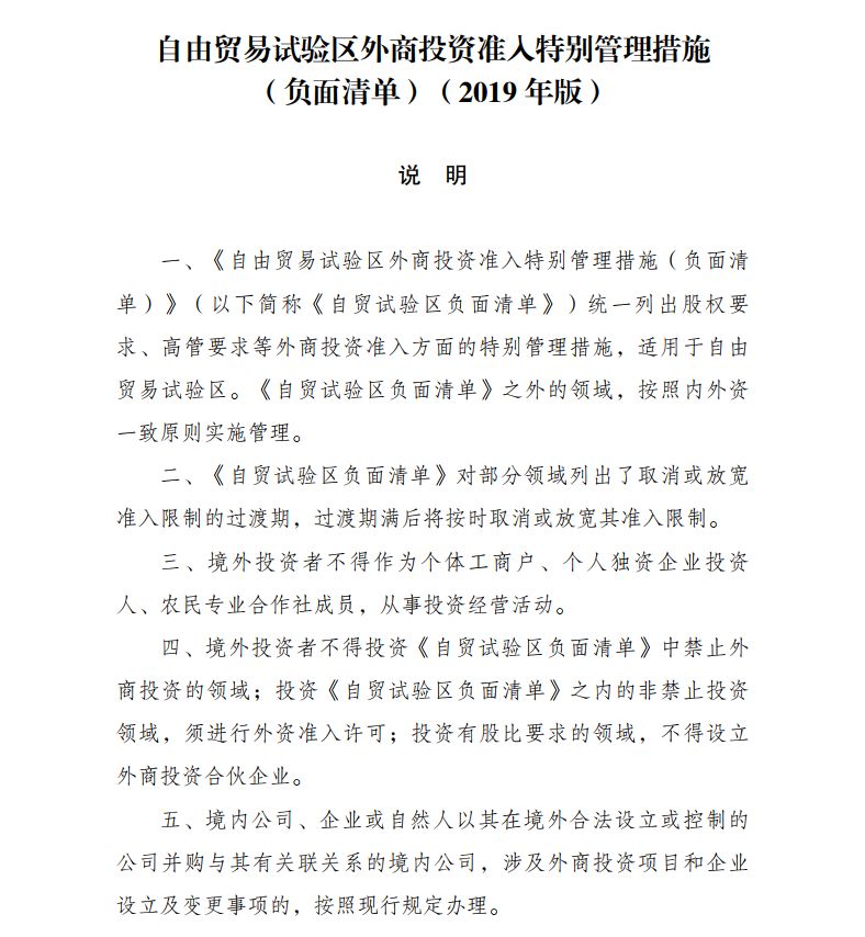 经党中央、国务院同意,国家发展改革委、商务部于2019年6月30日发布第25号令和第26号令,分别发布了《外商投资准入特别管理措施(负面清单)(2019年版)》和《自由贸易试验区外商投资准入特别管理措施(负面清单)(2019年版)》,自2019年7月30日起施行。《外商投资准入特别管理措施(负面清单)(2018年版)》和《自由贸易试验区外商投资准入特别管理措施(负面清单)(2018年版)》同时废止。