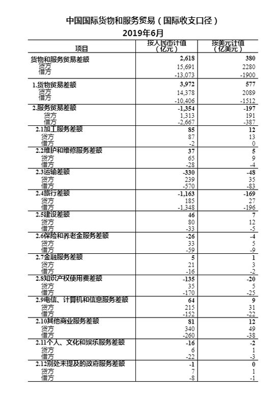 2019年6月,我国国际收支口径的国际货物和服务贸易收入15691亿元,支出13073亿元,顺差2618亿元。其中,货物贸易收入14378亿元,支出10406亿元,顺差3972亿元;服务贸易收入1313亿元,支出2667亿元,逆差1354亿元。