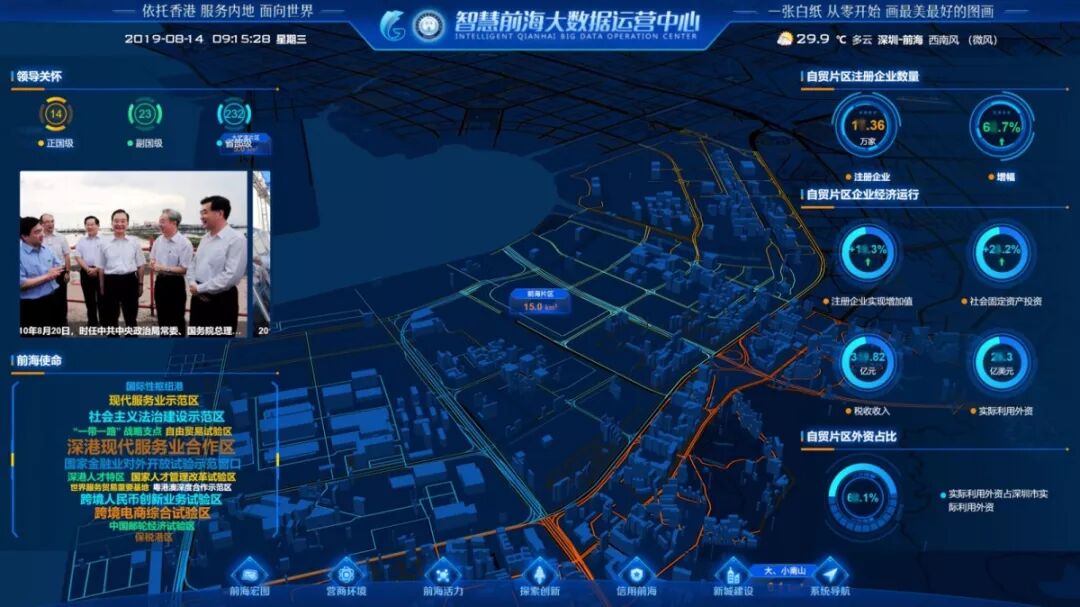 平台从企业信息、经济运行、城市建设、政策措施、创新成果、指标指数、基础地理、特别专题8大维度,实现了前海自贸区各类政务信息的有序汇聚、共享共用和精准展示,全方位展示了前海建设成就和创新成果,进一步促进前海智慧式管理和运行。主要有以下几个亮点:一是对多个政府部门的数据进行有序汇聚打造“数据湖”,极大地提升了信息共享能力和政府服务效能;二是首次实现自贸片区信息全景式集成有机展示;三是建立自贸片区经济体征指标体系,可全面了解前海的经济总体运行状态;四是在营商环境、归巢行动、制度创新、人才活力、信用监管等方面提供智能化支持。