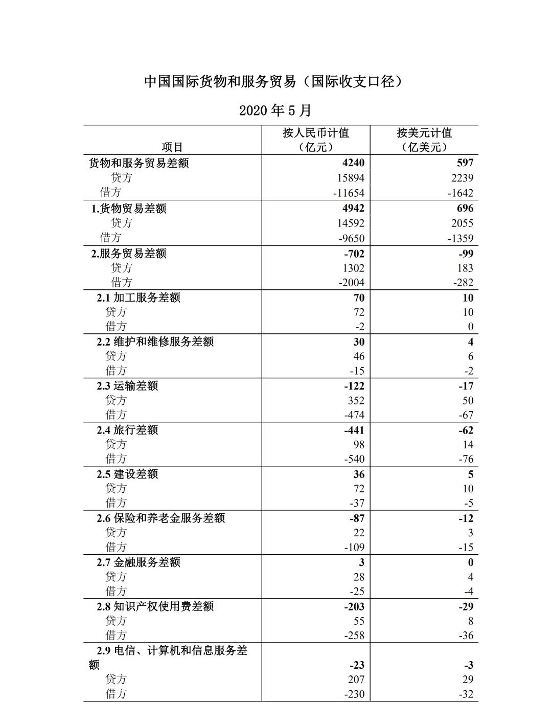 2020年5月,我国国际收支口径的国际货物和服务贸易收入15894亿元,支出11654亿元,顺差4240亿元。其中,货物贸易收入14592亿元,支出9650亿元,顺差4942亿元;服务贸易收入1302亿元,支出2004亿元,逆差702亿元。