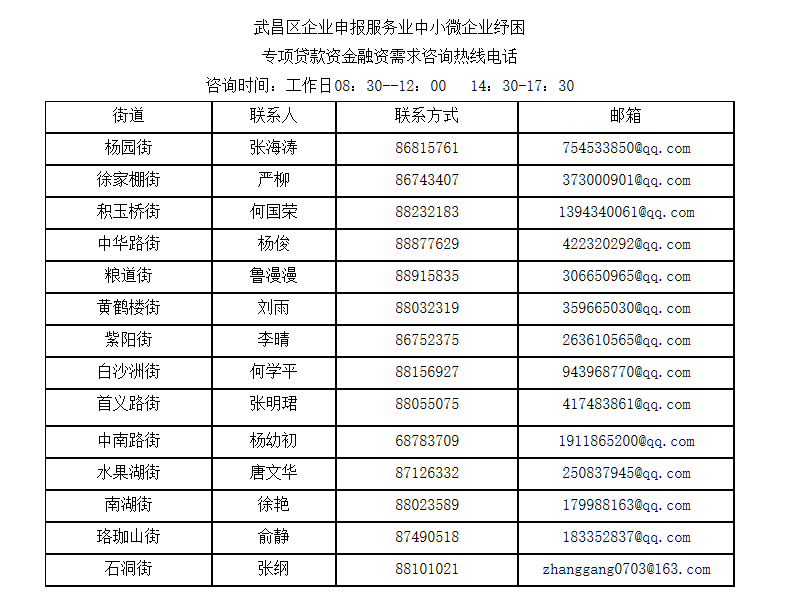 附件1:武昌区企业申报服务业中小微企业纾困专项贷款资金融资需求咨询热线电话