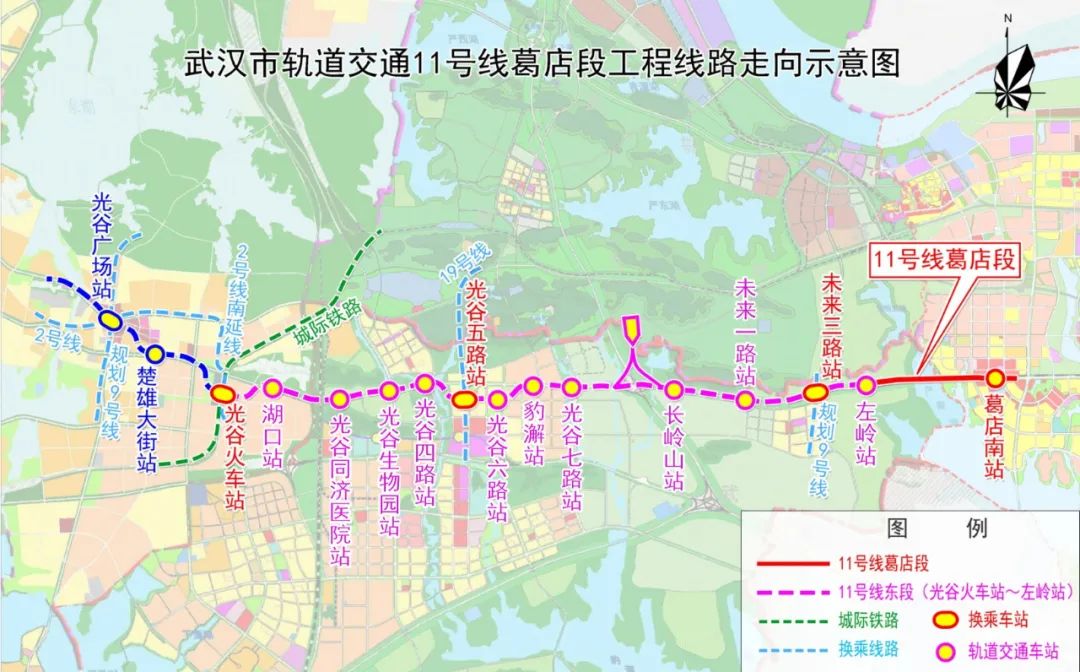 葛店段工程西起11号线左岭站,在高新大道与曹岭路交会处设终点站葛店南站,可与武黄城际线葛店南站换乘。本工程为一站一区间,全为地下线。线路全长约3.7公里,其中盾构区间全长3.1公里。