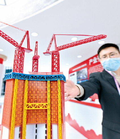 除了东风无人车,中建三局的“空中造楼机”也是湖北展区的一大亮点。记者现场看到,像一个“钢罩”套在建筑顶部,可建造千米级的超高层建筑的装备,就是“空中造楼机”。它不仅较传统施工装备更加安全智能,还可缩短20%的工期。