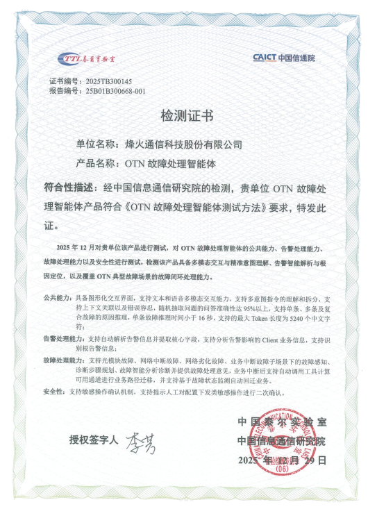 近日,烽火通信OTN故障处理智能体率先通过中国信息通信研究院泰尔实验室专业测试认证,这是国内传送网领域故障智能体技术首个专业化权威认证。同期,辽宁移动携手烽火通信成功完成故障智能体现网工程试点,标志着烽火通信故障智能技术已具备专业化、标准化应用能力,管控系统智能化运维正式迈入L4级别。