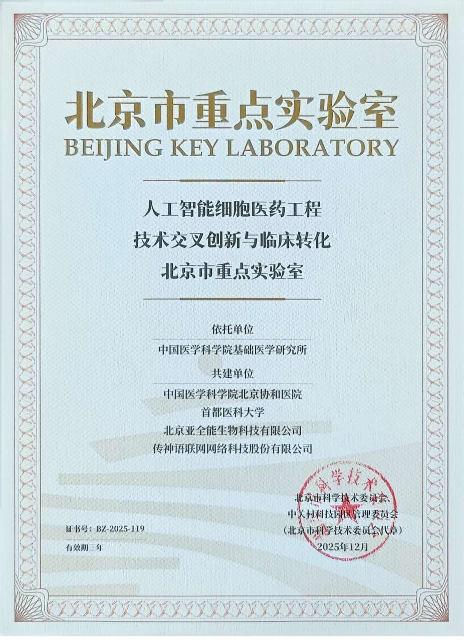 近日,北京市科学技术委员会、中关村科技园区管理委员会正式发布2024年、2025年通过重组认定的北京市重点实验室名单。其中,由中国医学科学院基础医学研究所牵头,联合中国医学科学院北京协和医院、首都医科大学等顶尖医教研实体,以及北京亚全能生物科技有限公司、传神语联网网络科技股份有限公司等行业领先企业共同建设的“人工智能细胞医药工程技术交叉创新与临床转化北京市重点实验室”成功获得批复认定。
