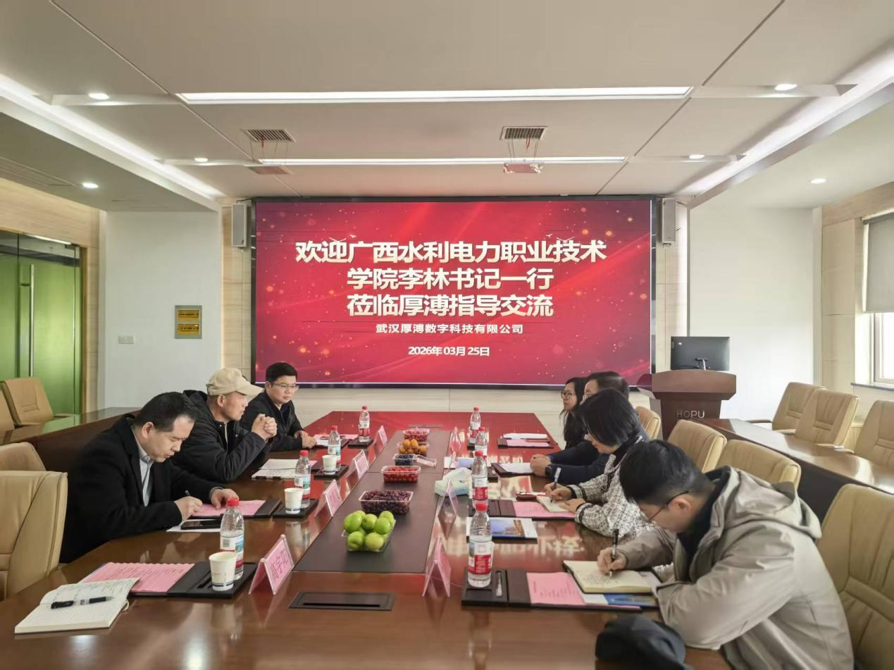 为深化产教融合、推进校企协同育人,推动职业教育高质量发展,2026年3月25日,广西水利电力职业技术学院党委书记李林、副校长吴美琼一行,赴厚溥企业集团(武汉总部)开展校企合作交流洽谈。厚溥企业集团董事长陈相阳、常务总裁翁高飞等企业负责人热情接待,双方围绕过往九年合作成果、未来合作规划等核心议题深入磋商。