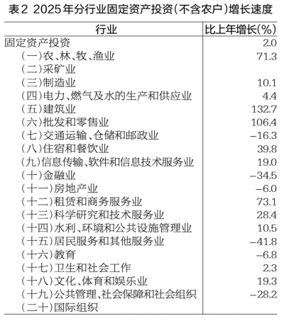 全年固定资产投资(不含农户)比上年增长2.0%。按产业分,第一产业投资增长64.1%;第二产业投资增长9.9%,其中工业投资增长9.7%;第三产业投资下降1.0%。基础设施投资增长2.5%。