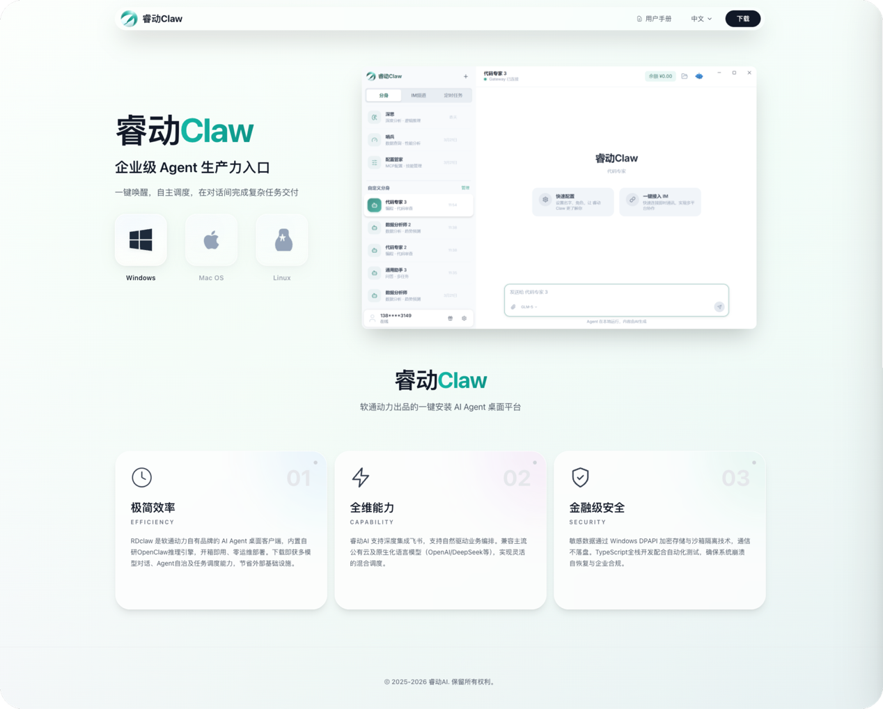 睿动Claw作为桌面级AI Agent平台,内嵌OpenClaw引擎,一键安装、零配置运行;安全覆盖加密存储、沙箱隔离与权限管控,为企业提供保障。