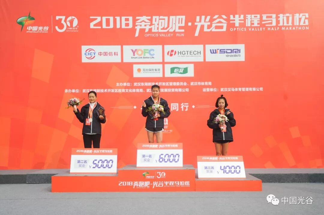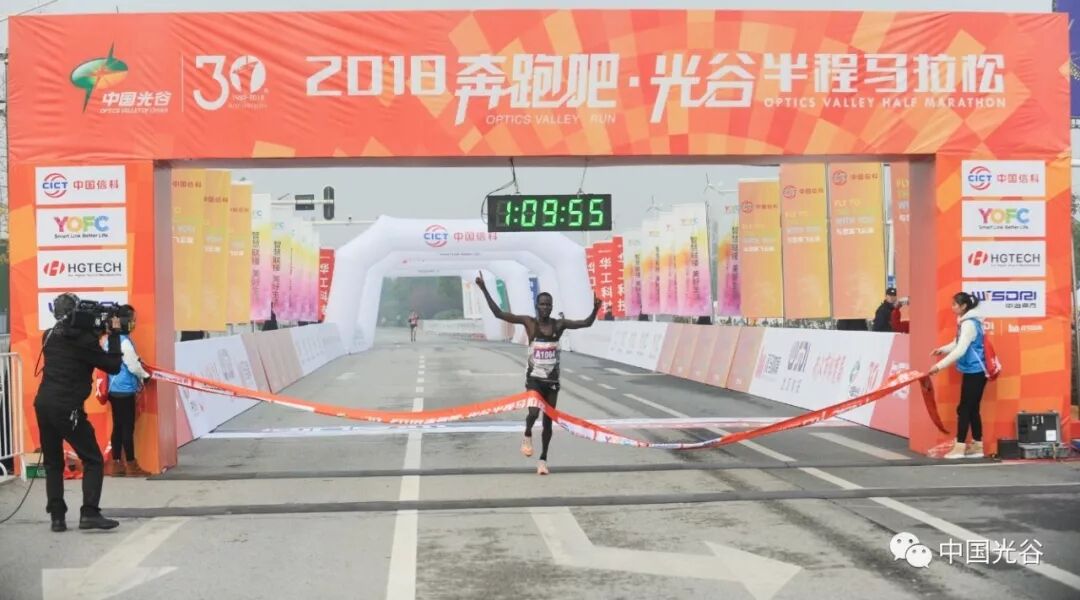 来自肯尼亚的EYANAEPAUL,以1:09:56的成绩夺得2018武汉奔跑吧·光谷半程马拉松男子组冠军。
