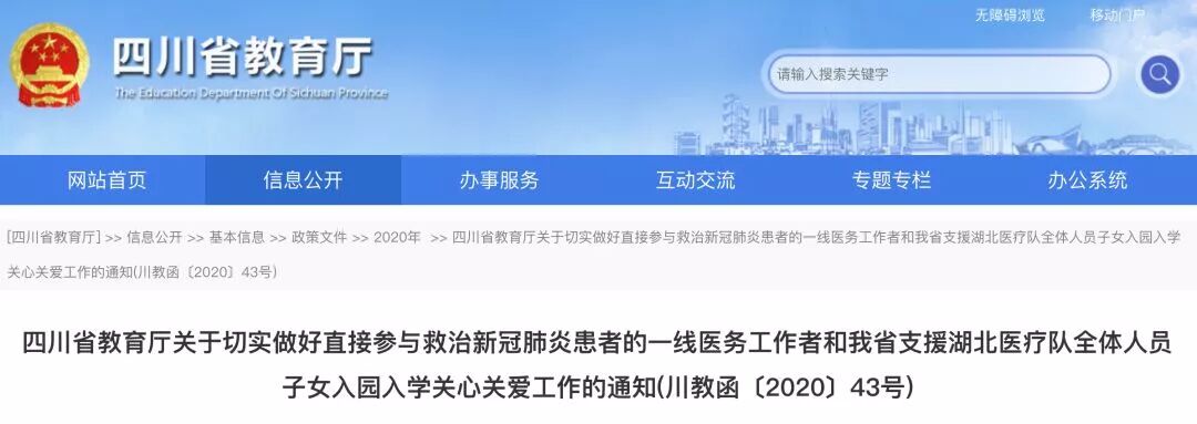 四川省教育厅日前发出通知,为切实解决好在省指挥部公布的定点医院直接参与救治新冠肺炎患者的一线医务工作者、我省支援湖北医疗队全体人员子女入园入学的后顾之忧,为其子女在接受学前教育到高中阶段教育期间提供一次按意愿选择学校(幼儿园)机会和参加高考服务指导。