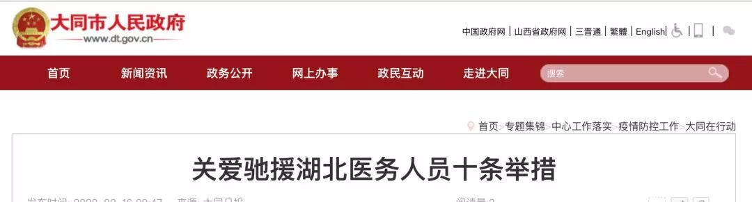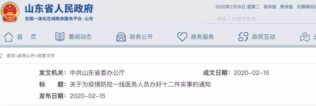 2月15日,山东省人民政府官网发布为新冠肺炎疫情防控一线医务人员办好十二件实事的通知。