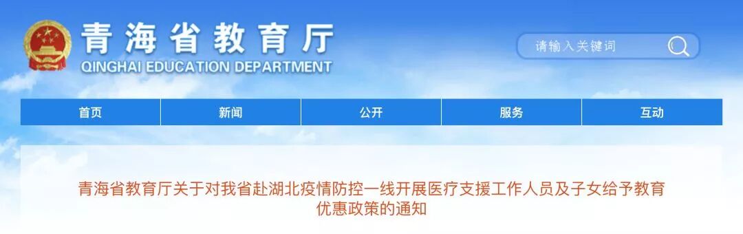 2月11日,据青海省教育厅,为让医疗救治工作者安心放心,全力以赴开展救治工作,切实解决他们及子女教育方面的后顾之忧,特制定相关入学、升学优惠政策。