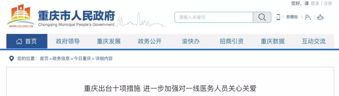 据重庆日报报道,重庆市近日印发《关于进一步加强对一线医务人员关心关爱的通知》,要求各区县党委、政府统筹安排,疫情防控期间对辖区内一线医务人员家庭全覆盖走访慰问,落实专人每周至少1次上门看望,帮助解决老人和小孩照护、家人生病及防护用品保障等困难和问题。此外,根据有关规定,对一线医务人员子女入园入学给予适当照顾。