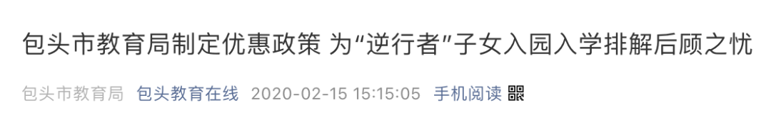 内蒙古包头市教育局发布消息称,全力保障、优先安排市新冠肺炎疫情防控指挥部确定的定点医院直接参加隔离病区救治工作的一线医务人员和支援湖北医疗队全体医务人员的子女2020年入园入学。普通高中在中考招生时可不受学籍年限限制,享受当地分招政策,同时享受20分加分政策(累计加分不超过20分)。