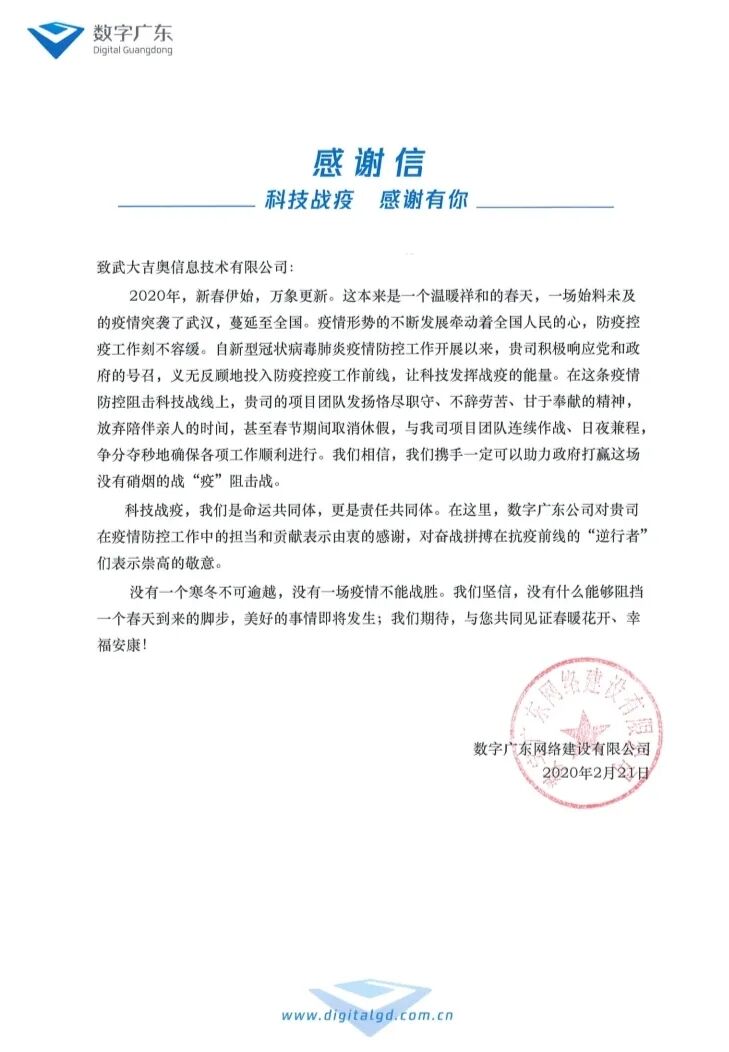 据不完全统计,春节以来,武大吉奥持续为湖北、广东、江西、黑龙江、山西、南京、兰州、深圳、九江、瑞安等多省市地区提供疫情防控相关的信息化服务,为各地疫情的精准防控提供了技术支撑。隔离不隔心,正是吉奥人一如既往的初心与坚持,才换来了客户的认可和赞许。这不,一封来自南方的感谢信,温暖伴我们继续前行。