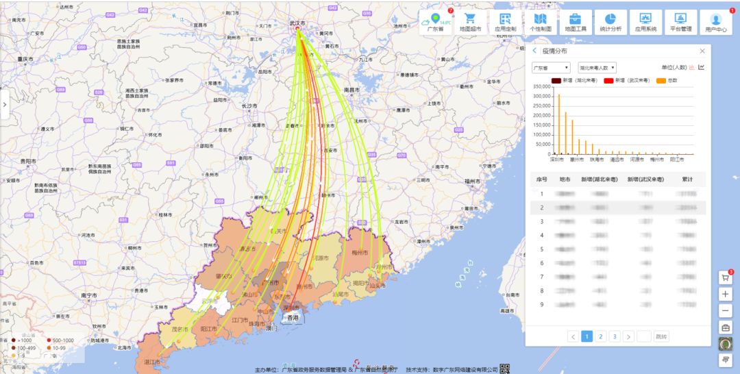 眼下正值各地陆续复工和疫情防控关键期,“粤政图”通过疫情精准定位、态势等级预判、网格化疫情监管、疑似人员动态跟踪等态势呈现,形成地区疫情监测等统计信息,为相关部门提供及时、可靠、有效的数据,促进广东全省高效防控。通过对湖北返粤人员的迁徙情况进行热力、线性展现,为交通、防控、物资调配等提供重要的科学决策参考。