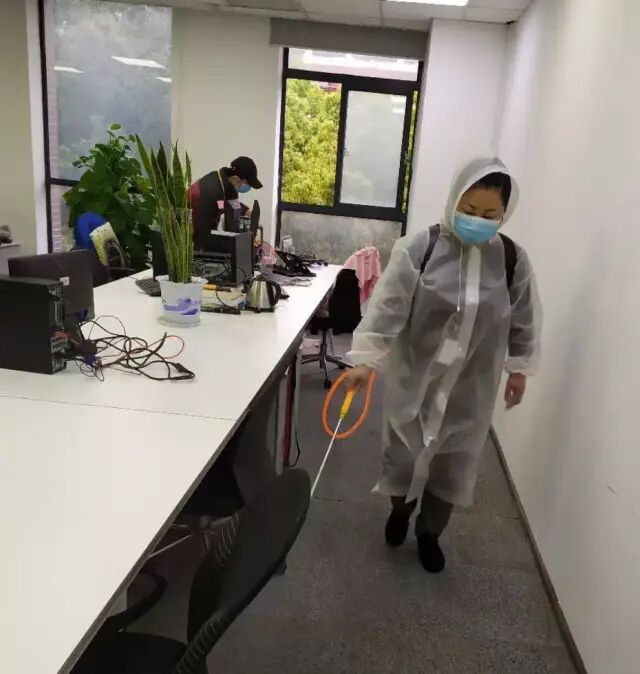 目前已对办公楼各个区域进行了消毒,茶水间,卫生间,每层楼梯间以及前台配置洗手液和消毒液。