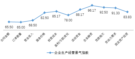 企业景气指数显示,一季度企业综合生产经营景气指数(BSI)为93.67。仅有10.83%的受访企业对本季度企业综合经营情况表示乐观,29.17%的企业本季度综合经营情况不佳;20.83%的受访企业对下季度经营情况持乐观态度,19.17%的企业对下季度经营情况持悲观态度。