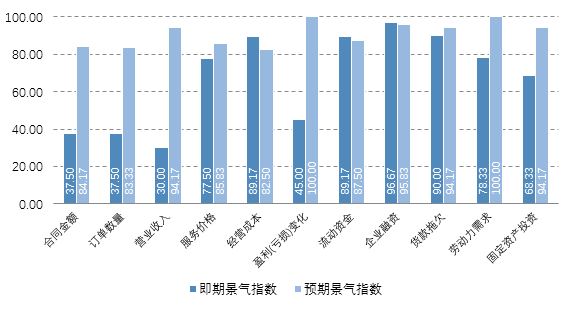 一季度中国服务外包企业经营分项指标均低于100枯荣线,在分项指标中,排名前五的指标分别为企业融资(96.17)、货款拖欠(92.5)、劳动力需求(91.33)、流动资金(88.17)和经营成本(85.17)。此外,合同订单数量(65)、合同金额(65.5)、营业收入(68.5)是最低的三项,表明在新冠肺炎疫情冲击下,合同订单数量持续减少,中国服务外包企业收入持续下滑。但企业家对第二季度的预期景气指数有所回升,尤其是对营业收入、合同金额、订单数量和盈利(亏损)变化等方面持乐观态度。