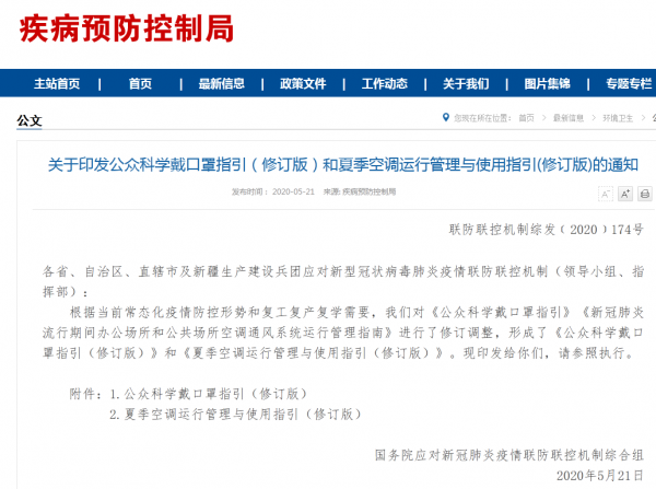 5月21日,国家卫健委发布了适用于新冠肺炎疫情低风险地区的《公众科学戴口罩指引(修订版)》和夏季空调运行管理与使用指引(修订版)。