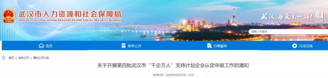 为鼓励武汉市重点产业企业引进、培育紧缺人才,充分发挥人才在转型升级和创新发展中的引领支撑作用,根据《武汉市“千企万人”支持计划实施办法》(武人社发[2016]20号)文件精神,市人力资源和社会保障局现就做好第四批“千企万人”支持计划企业认定申报工作通知如下: