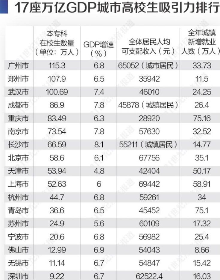 据了解,该排名通过五个维度对17座2019年GDP过万亿的城市进行分析,包括高校在校生数量、就业、医疗、教育和房价。