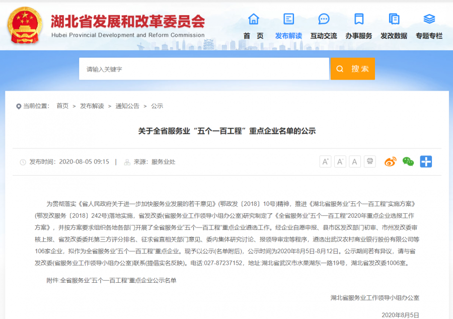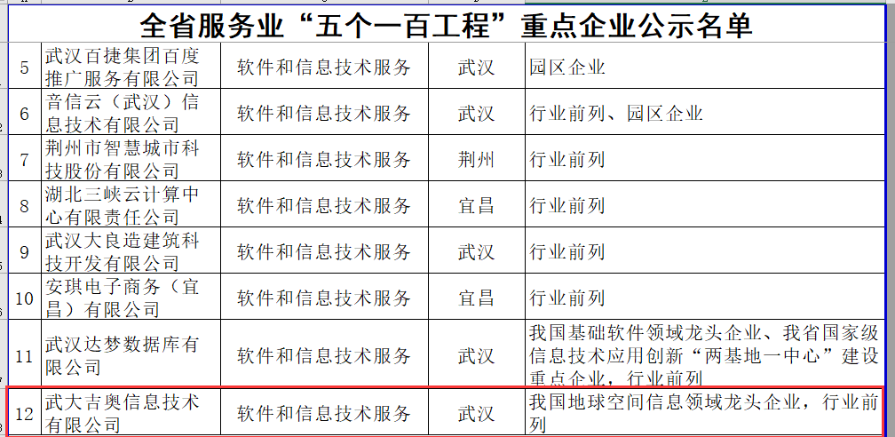 近日,湖北省发改委公示了全省服务业“五个一百工程”重点企业名单,来自金融、现代物流、研发设计和科技服务等领域的106家企业榜上有名,协会会员企业武大吉奥成为软件和信息技术服务领域入选的12家企业之一。