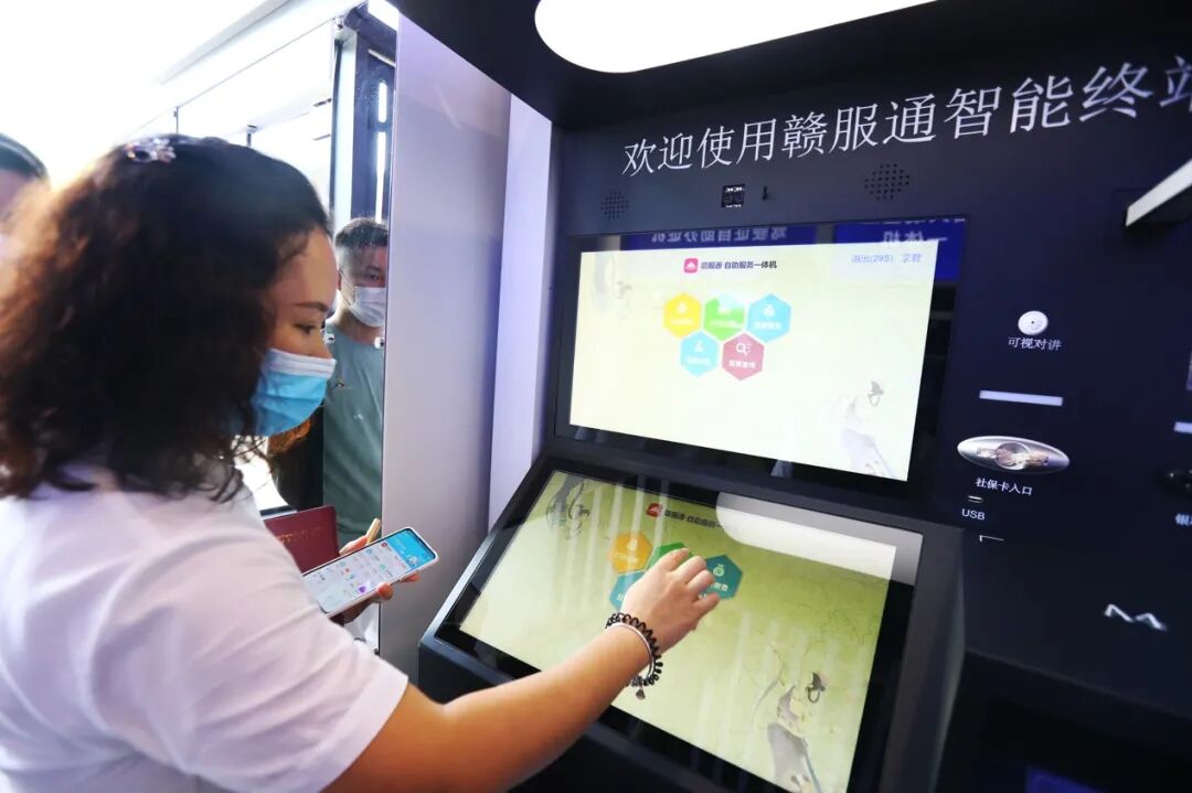 (2020年8月17日,江西省新余市,市民利用“赣服通”智能终端办理个人事项。)