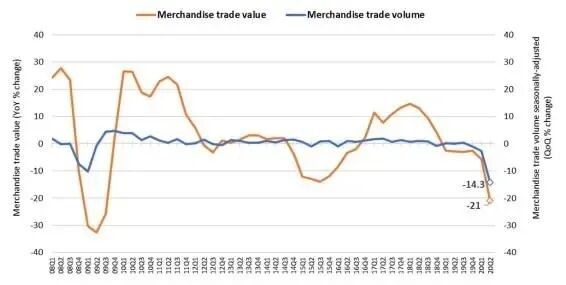 2020年以来,世界经济形势急剧变化,全球受到新冠肺炎影响,多数企业经济受创甚至倒闭。根据9月23日发布的数据,2020年第二季度全球商品贸易量下降了14.3%,其中欧洲和北美地区跌幅最大。最新的贸易收缩幅度超过了金融危机期间(2008年第三季度至2009年第一季度)下降记录的10.2%,在全球封锁下,第二季度世界商品贸易量下降14%,价值下降21%。