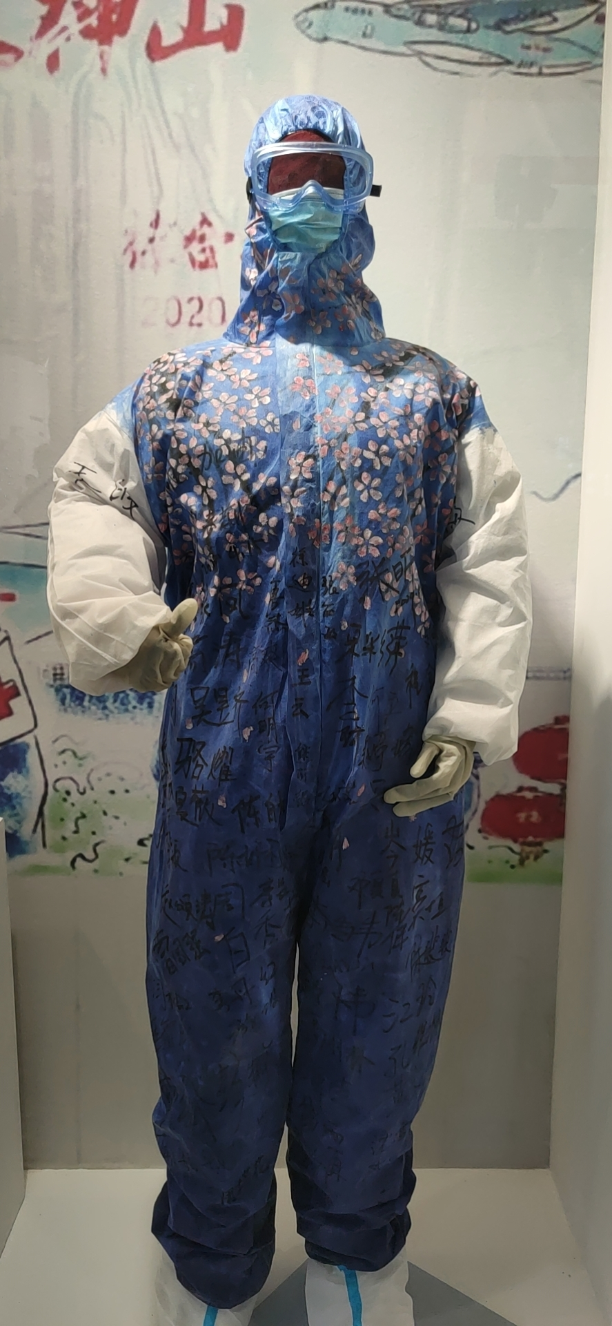 疫情中,协会与会员单位从不同的方面积极向社会贡献力量,奋力响应政府号召,在能力范围内不遗余力的为抗击疫情献力,更是在观展过程中发现协会为抗疫志愿者团队成员们捐购中国人民保险的抗疫特别险种,团队负责人之一雷春莉女士亲手画制的“樱花战袍”也出现在展览中。