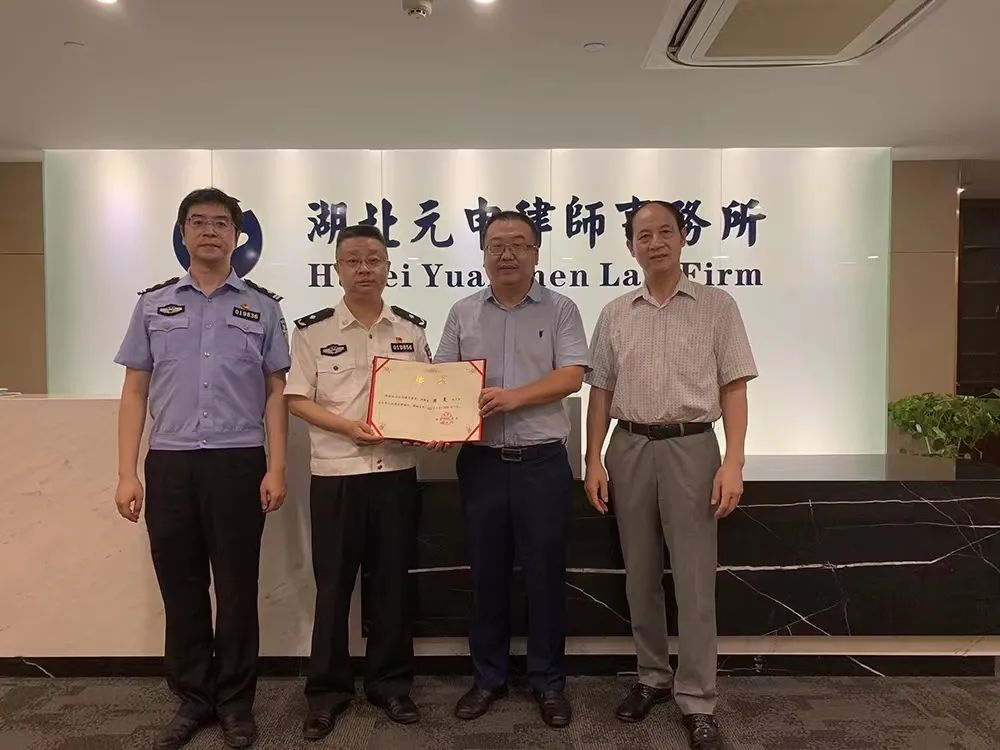 2022年8月16日,武汉市公安局法制支队副支队长张克军一行莅临协会理事单位——湖北元申律师事务所,向该所陈昊律师颁发了武汉市公安局法律顾问《聘书》,并就法律服务工作与该所主任罗玉章、执行主任陈昊进行了深入交流。