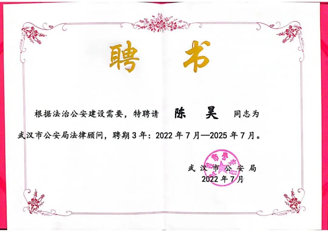 为推进法治公安建设,健全依法决策机制,提升执法规范化建设水平,武汉市公安局决定组建法律顾问。陈昊律师表示将切实担负起法律顾问的职责,在今后工作中将不负重托、不辱使命,切实发挥好参谋助手作用,认真履职尽责,积极努力工作,为武汉市公安局科学决策、民主决策、依法决策提供优质高效法律服务,为法治武汉建设贡献智慧和力量,为武汉市市域社会治理体系和能力的现代化作出贡献。